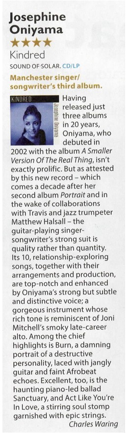 "Relationship exploring songs, together with their arrangements and production, are top-notch and enhanced by Oniyama's strong but subtle and distinctive voice; a gorgeous instrument" Charles Waring, MOJO magazine